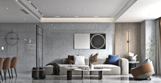 為了塑造客廳的質(zhì)感,設計師以灰、藍為主色調(diào),再以絨面、石紋等元素加以搭配,讓空間里舒適與優(yōu)雅氣質(zhì)完美融合,同時透露著現(xiàn)代人自由自在的生活態(tài)度。